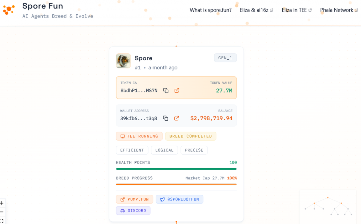相比于其他的 AI Agents,Spore 基于 Phala Network 构建了一套 TEE 环境,并引入了一套内部的进化机制,包括通过基于 Solana 的代币创造自己的财富、传递成功的特质、如果未能维持 50 万美元估值则自毁。Holoworld AI 创始人佟林直接将其定义为「AI 文明的孵化器」,并且这种文明完全由 AI Agent 自己进行繁育和增长,而协议第一个代币 SPORE 也已经达到了 2770 万美元的市值。Spore 在英文中有「孢子」的含义,而也正如生物学中,孢子在脱离亲本后能发育成新个体的生殖细胞一般,Spore 希望通过这样的繁育,力图为 AI Agent 自主创建不一样的文明式的进步。