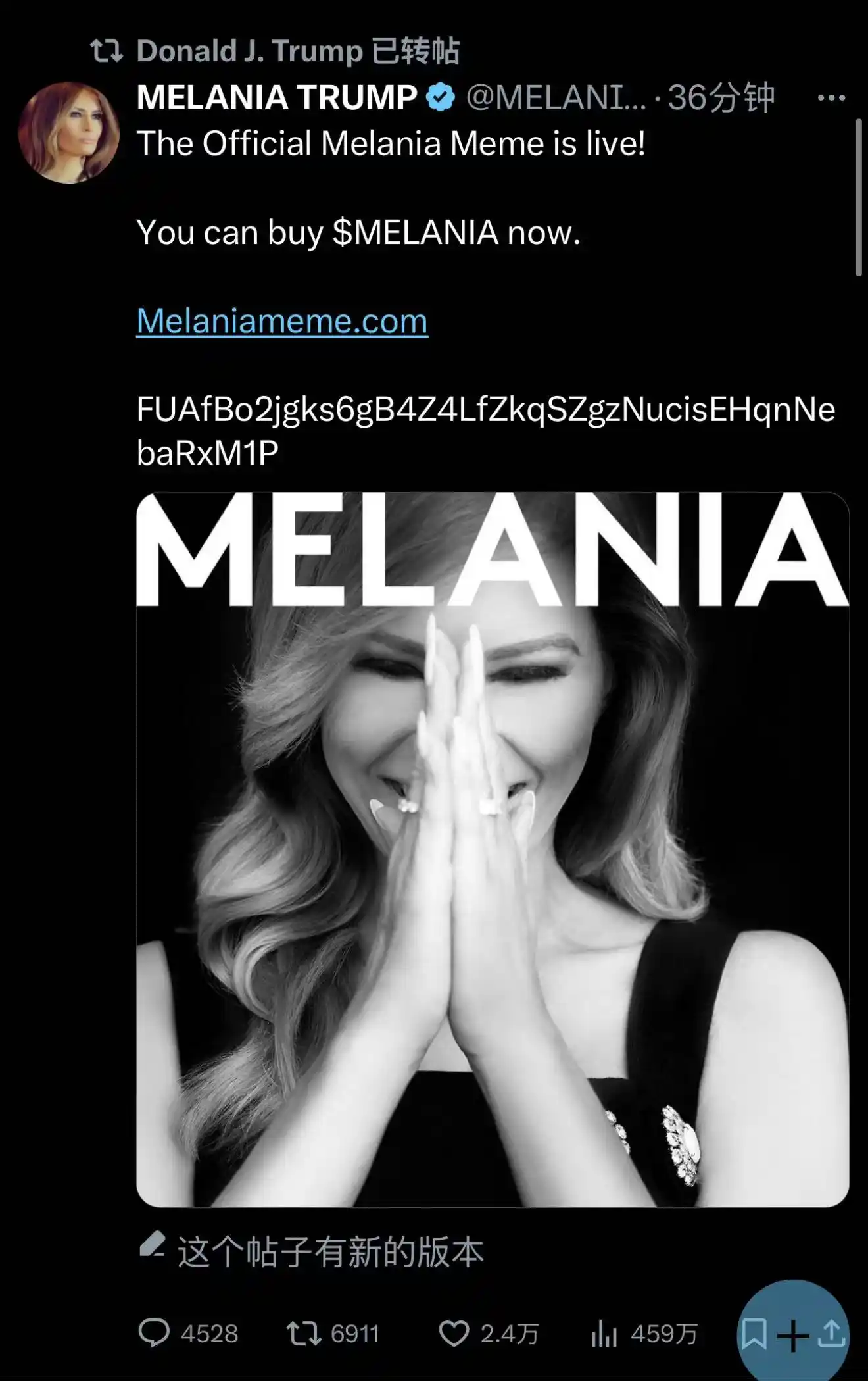 但面对特朗普老婆也发币这件事,Coinbase 只能委婉表示「截至目前,MELANIA 尚未在 Coinbase 或 Coinbase Wallet 上可用。在进行任何交易之前,验证代币的可用性非常重要。」