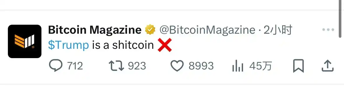 连特朗普比特币大会主办方 Bitcoin Magazine 都直接发帖称「TRUMP 是个垃圾币」,估计和小编的钱包遭受了同样的待遇。