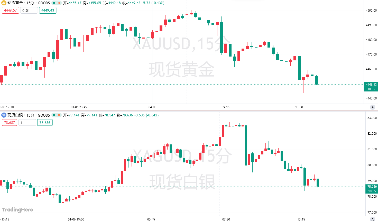 周三,现货黄金盘中一度跌破4450关口;白银跌超3%,今年迄今仍上涨了10%;现货铂金、钯金短线下挫,日内一度跌超7%和5%。